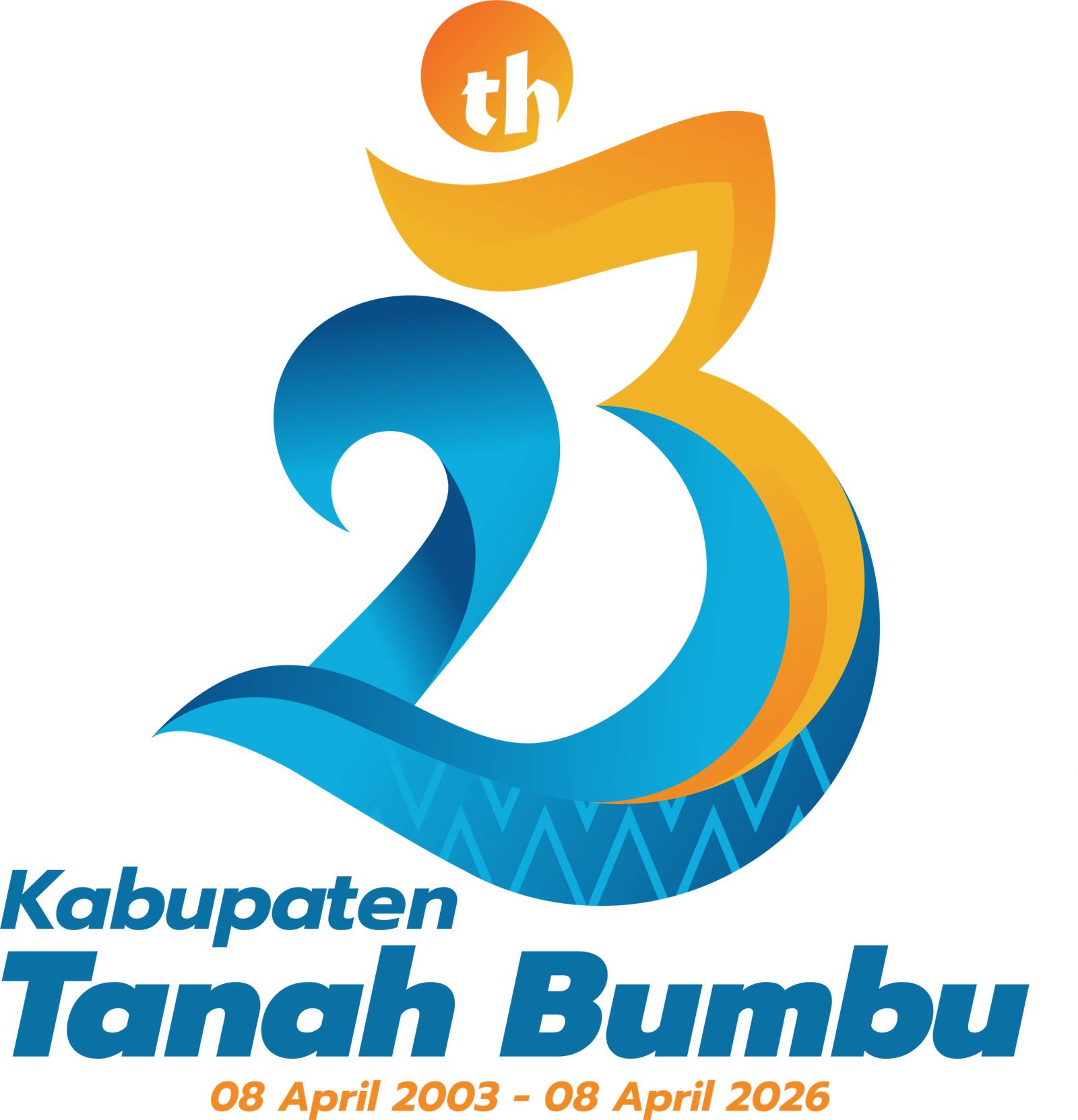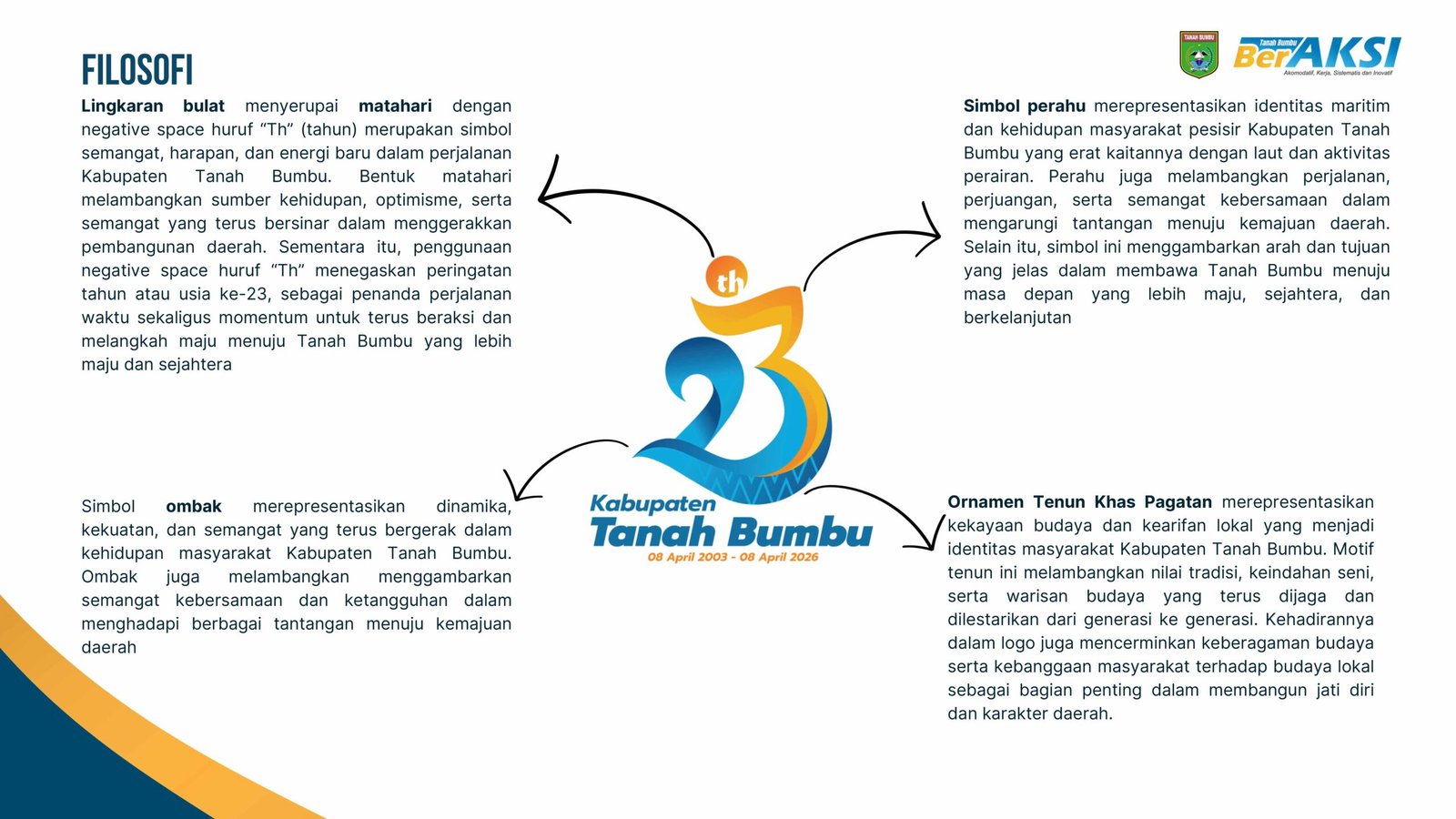 Sementara itu, penggunaan negative space huruf “Th” menegaskan peringatan tahun atau usia ke-23, sebagai penanda perjalanan waktu sekaligus momentum untuk terus beraksi dan melangkah maju menuju Tanah Bumbu yang lebih maju dan sejahtera.